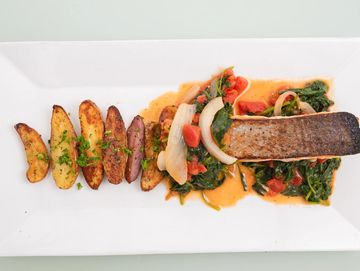 broiled salmon, sautéed onions, tomatoes, fresh spinach, garlic, dill, roasted potatoes